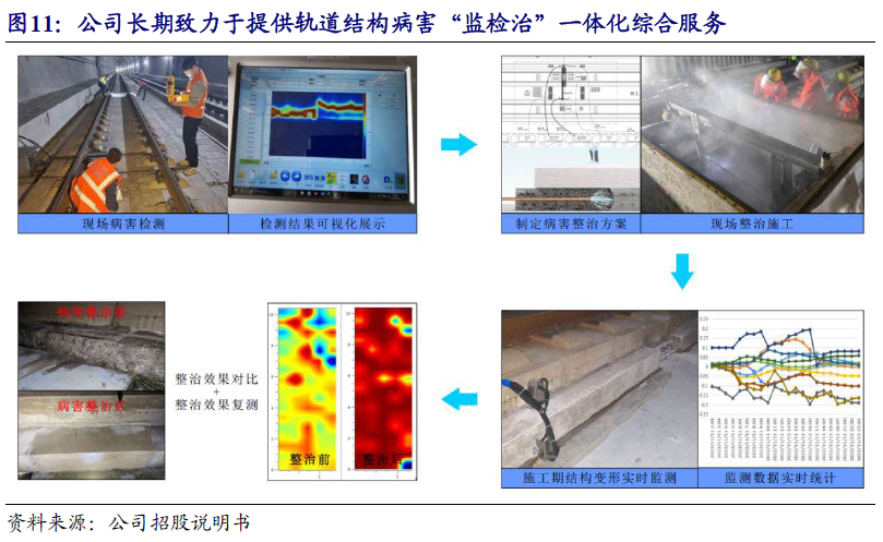 公司的线路结构病害综合整治服务现已运用于京沪高铁、贵广线、成自线、重庆兴隆场/达州/成都北编组站等。