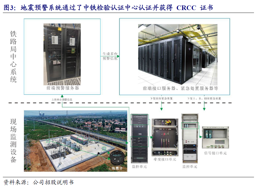 公司的地震预警系统全套设备具备干扰识别、地震拾取、震级预警、热备冗余等多项公司自主研发的技术,结合大数据运维技术,使设备具有较强的环境适应能力和可靠性,在地震高烈度地区得到了应用,如:成渝高铁、成贵高铁、京唐高铁等;多次应用于国家重大铁路建设项目,包括:中国首条智能高速铁路——京张高铁、山区高速铁路——成贵高铁、西部陆海新通道——南崇高铁及成渝高铁、京雄高铁、郑济高铁、京唐高铁等;多次成功监测到铁路沿线周边发生的强烈地震并及时发出预警信息,如 2021 年 9 月 16 日泸县 6.0 级地震,震中距约 32 公里,系统提前 5 秒发出预警;2022 年 9 月 5 日泸定 6.8 级地震,震中距约 227 公里,系统提前 25 秒发出预警;2023 年 5 月 22 日宜宾 4.5 级地震,震中距约 139 公里,系统提前 21 秒发出预警,为铁路运营安全保驾护航。目前公司的地震预警系统中标了 25 条高铁线路,公司地震预警系统主要集中在北京、成都、郑州、南宁、上海等铁路局集团公司。