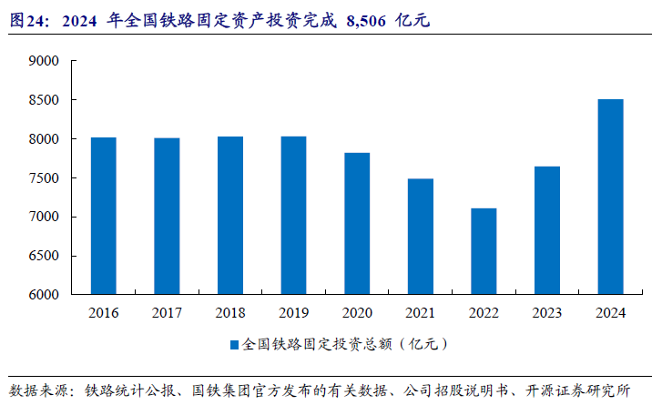 2023 年,全国铁路固定资产投资完成 7,645 亿元,投产新线 3,637 公里,其中高速铁路 2,776公里。全国铁路营业里程 15.9 万公里,其中高铁 4.5 万公里;根据国铁集团官方发布的有关数据,2024 年全国铁路固定资产投资完成 8,506 亿元,同比增长 11.3%,时隔 5 年再次突破 8000 亿元大关,创投资历史新高。