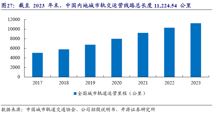 中国是目前全球城市轨道交通运营里程最长的国家。根据中国城市轨道交通协会统计信息,截至 2023 年末,中国内地共计 59 个城市开通城市轨道交通,运营线路 338 条,运营线路总长度11,224.54 公里。2023 年新增运营线路 25 条,新增运营线路长度866.65 公里。