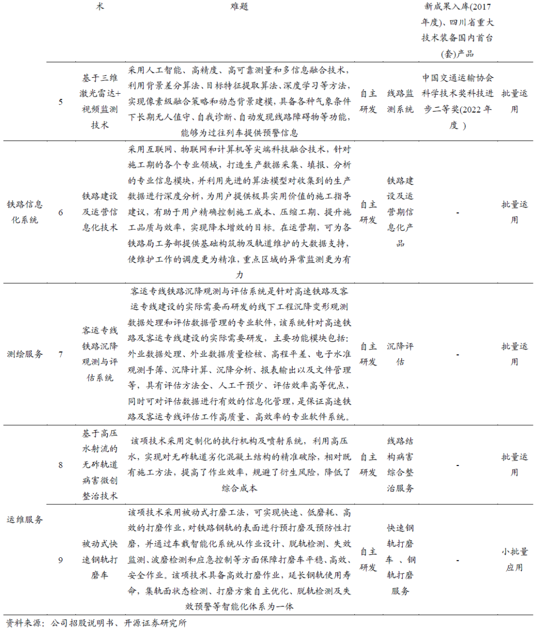 公司坚持以科技创新和技术成果产业化为己任,一直专注于轨道交通行业前瞻技术研究,承担或参与了多项国家、省部级及国铁集团重大及重点科研课题。公司参与了国铁集团与中国地震局联合研制的“高速铁路地震预警系统”的研发工作,相关产品通过 CRCC 认证,成为该类产品通过认证的三家供应商之一;公司的“高速铁路道岔钢轨伤损监测系统”、“客运专线铁路沉降观测与评估系统”系第一批通过国铁集团技术评审的该类产品;公司的快速钢轨打磨车于 2024 年上半年正式验收并上线使用,打破了快速钢轨打磨装备的国外技术垄断。