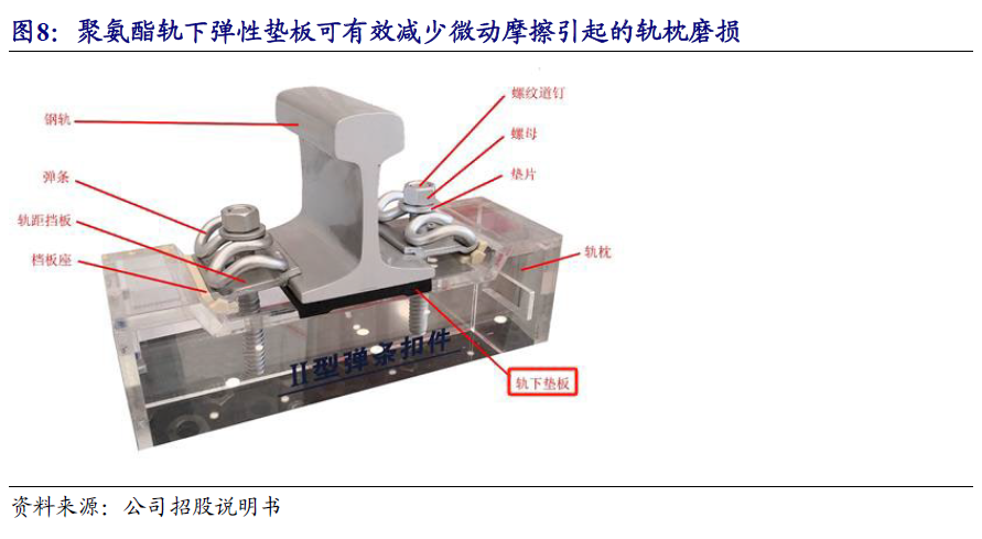公司利用聚氨酯材料研发了一系列聚氨酯材料产品,如聚氨酯轨下弹性垫板、聚氨酯减振垫等。公司的聚氨酯材料产品兼顾耐高/低温性能、耐油/耐水性能,其优异的恒久压缩变形性能使其在长期高负荷工作下仍具有较好的回弹性能。