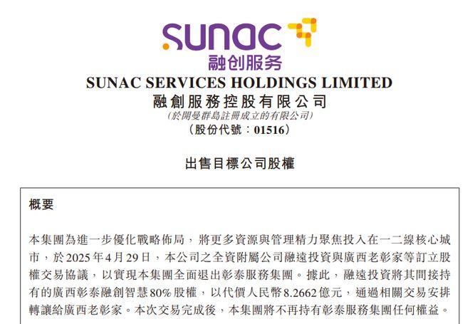 乐居财经 李兰 4月30日,融创服务(01516.HK)发布公告,其全资附属公司融远投资与广西老彰家签署股权交易协议,以8.2662亿元对价转让广西彰泰融创智慧城市运营管理有限公司(以下简称“广西彰泰融创智慧”)80%股权,以实现其全面退出彰泰服务集团。