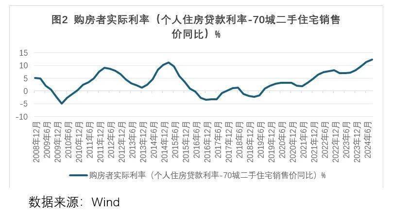 在计算实际利率时,不同的经济主体、不同的经济行为,应该选择不同的名义利率与通胀数据。对于购房者而言,我们以5年期按揭贷款利率与二手房价格指数来计算实际利率,按揭贷款实际利率=5年期按揭贷款利率-二手房价格指数。