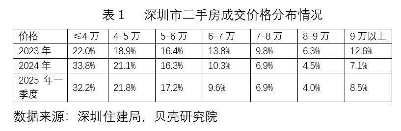 部分城市房价指标已经连续数月回升,是否可以判断房地产市场已经止跌回稳?答案是否定的。部分城市的房价回升的主要原因是二手房成交结构出现变化。以深圳为例,2024年10月份之后,深圳的二手房价出现连续5个月环比上升,备受市场关注。从调研中我们了解到,导致深圳二手房价上涨的主要原因是成交结构出现变化,即核心区域的高价房的成交占比增加所致。2024年、2025年第一季度单套总价400万以下的住房占比从56.1%下降至53.4%,但400万-600万的房子占比从22.6%提高到24.6%,单价600万以上二手房的占比从21.3%提高到22%。从二手房成交价格看,价格低的二手房成交占比降低,而价格高的二手住宅成交占比提高,2025年第一季度成交价小于4万元/平方米的住宅占比为32.2%,比2024年降低1.2个百分点,单价为4-5万元/平方米的住宅占比提高0.7个百分点,单价5-6万元/平方米的住宅占比提高0.9个百分点,单价高于9万元/平方米的住宅占比提高1.4个百分点(参见表1)。